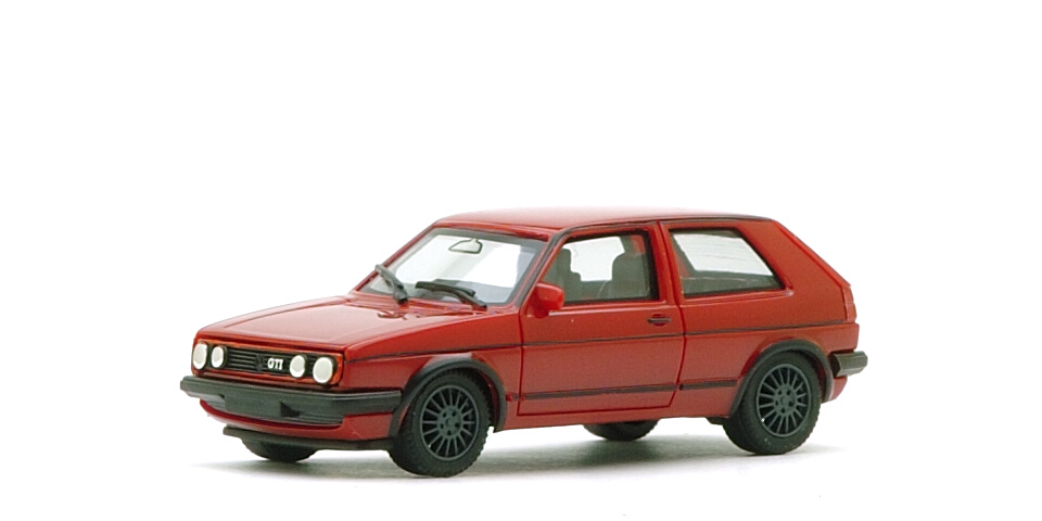 こちらが1988年モデルのGTI。実車同様リアゲート中央部にVWマークのモールドが追加されています。じつはこのタイプの中でも、さらに車台側の色がグレイか黒かという違いがあり、Signalrotの1と2がその例。黒い車台のほうがより新しい製品になります。また、1984年モデルと1988年モデルの過渡的ボディも存在します。Reinweiß-1とSignalrot-3はMärklinの「工場構内貨車セット」に含まれているものですが、この型では左右両方にあるはずのドアミラーを表現した突起が左側にしかありません。