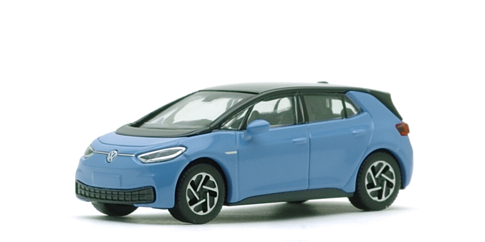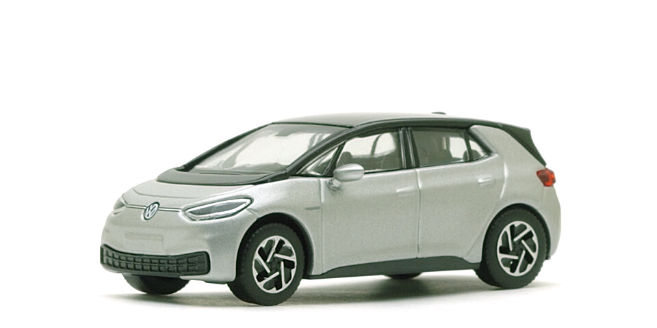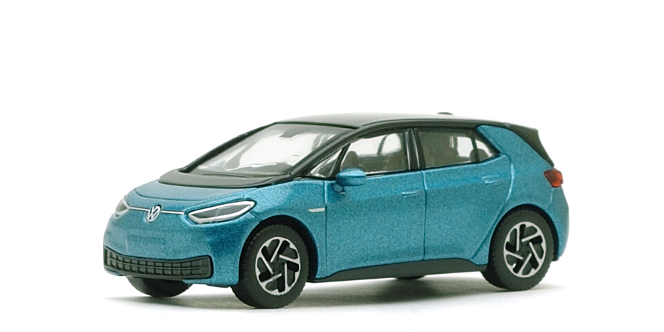 2010年代の後半から、Volkswagenの現行車(新型車)はさまざまな事情により各ミニカーメーカーともに新規作成を控えてきたのですが、長期に及んだその無風状態を突き破ってとうとうHerpaがID. 3をミニカー化してきました。さすが大手、お久しぶりでも仕上がりにはまったく隙がありません。標準品ですが前フェンダーやリアゲート中央の車名バッジもしっかりプリントで表現されています。複雑な形状でかつ2色が塗り分けのオプション"East Derry"18インチ・ホイールも緻密に成型されています。