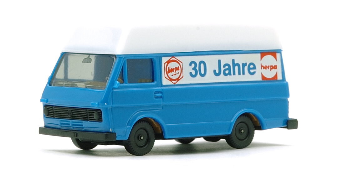 Herpa製LT kasten、"Hochdach"(ハイルーフ)仕様。これらのミニカーが登場した1980年前後の時期、まだまだ1:87スケールの自動車は鉄道模型の付属品の位置を脱しきれてはおらず、それゆえHerpaでもさまざまなアクセサリーを用意していたようで、中にはハイルーフのルーフ部分だけというものもあったようです。したがってここに展示したミニカーがオリジナルの状態から既にハイルーフであったかどうかは怪しいものがあります。