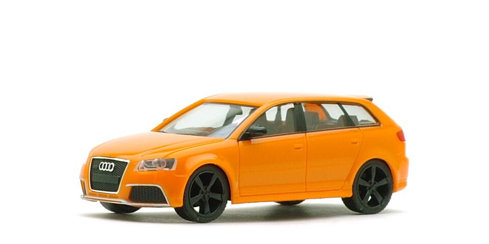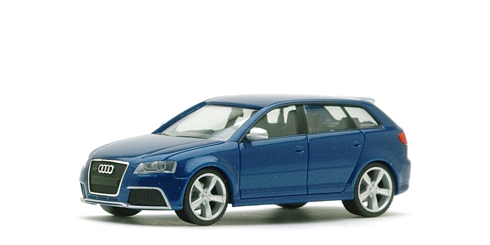 コスト上の制約から、同一車種の中でも外観が大幅に異なるバリエーションは作られないのがほとんど常である1:87スケール・ミニカーの世界において、しかも「原型」であるA3 Sportbackが出てから7年近くも経過してからRS 3がしかもHerpa標準品でリリースされたのはなぜなのでしょうか。Audiでは2010年以降、メディア向け限定のノベルティを製作するようになっているのですが、その中に"S"や"RS"のような車種のミニカーが通常の特注品/別注品とは異なる「珍しいミニカー」として同梱されるケースが増えていて、RS 3ももともとはそんな中の1台だったのですね。ところが、この"Pressekit"版のそれはA3 Sportbackの金型を流用したものに過ぎず、例えばフロントのサイドベントのような特徴的な部分を後から黒で塗りつぶして雰囲気だけ似せていたという代物だったのです。そんな中、よほど評判が悪かったからなのか、Audiからお叱りを受けたからなのか、はてまたHerpa自身が納得できなかったからなのかそのあたりの経緯はよくわかりませんが急遽作り直され2011年7/8月標準品としてラインアップされたのがこちらのRS 3というわけ。