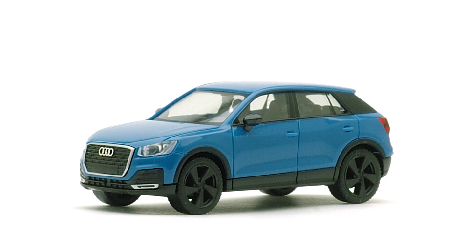 1:87スケール・ミニカーはHerpa製。さすがにそつのない仕上がりです。Korallenorangeのホイールが黒く塗られているためイメージがかなり異なりますが、当然のことながらこれら2台の仕様はまったく同一。実車の発表時に公開された画像とはフロントアンダーグリルの造形が異なりますが、これはトリムレベルの違いによるもの。ミニカーは「無印」のQ2のアンダーグリルを装着している模様(周囲をメッキされた「大口」グリルは"sport"および"design"に標準装着される)。さらにはマフラーエンドが左側1本出しとなっているので、モデルとなった実車は「無印」の1.6 TDIではないかと思われるのですが、これはたいへん不思議なこと。Herpaの製作するAudi別注品では、たいてい元ネタを「いちばん豪華な仕様」に求めるのが通例ですので。